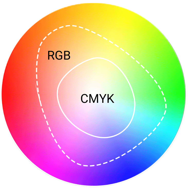 • Because it relies on ink rather than light, CMYK has a smaller color gamut—so some vibrant RGB colors can appear duller when printed.